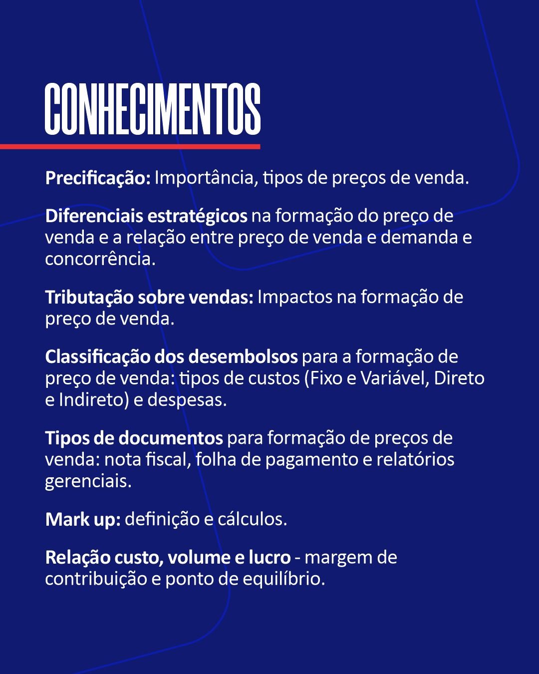 Com carga horária de 15 horas, o curso é uma realização da Fecomércio, Senac, Sincoval em parceria com a CDL Lages e conta com o renomado professor Cleveonei da Silva. Durante as aulas, serão abordados os principais aspectos financeiros e mercadológicos das organizações comerciais para que os alunos possam precificar de forma adequada seus produtos e serviços.