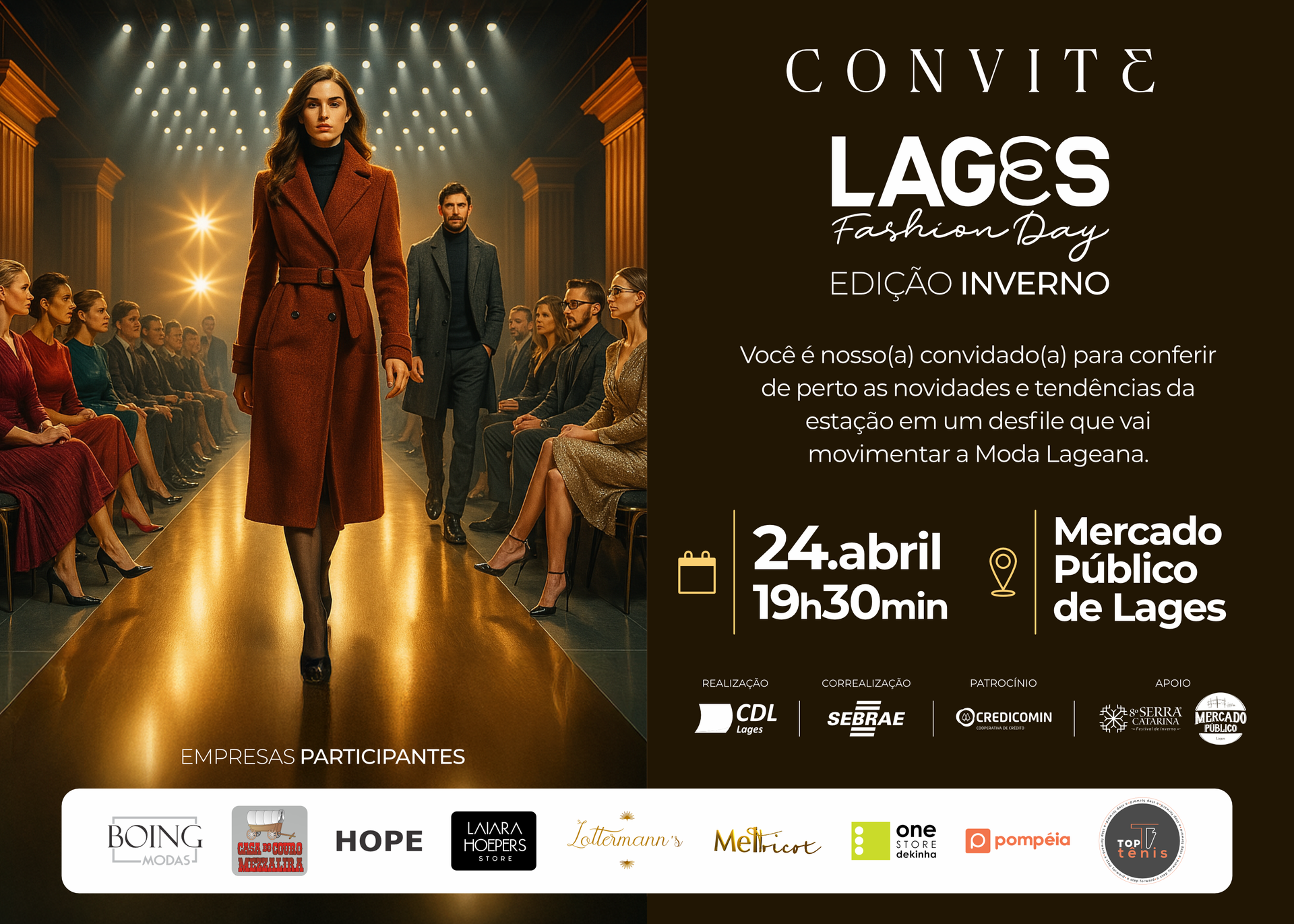 Realizado pela Câmara de Dirigentes Lojistas (CDL) de Lages, com correalização do Sebrae, patrocínio da Credicomin, apoio do 8º Serra Catarina Festival de Inverno e Mercado Público o Lages Fashion Day se destaca como uma vitrine das tendências da moda outono/inverno.
