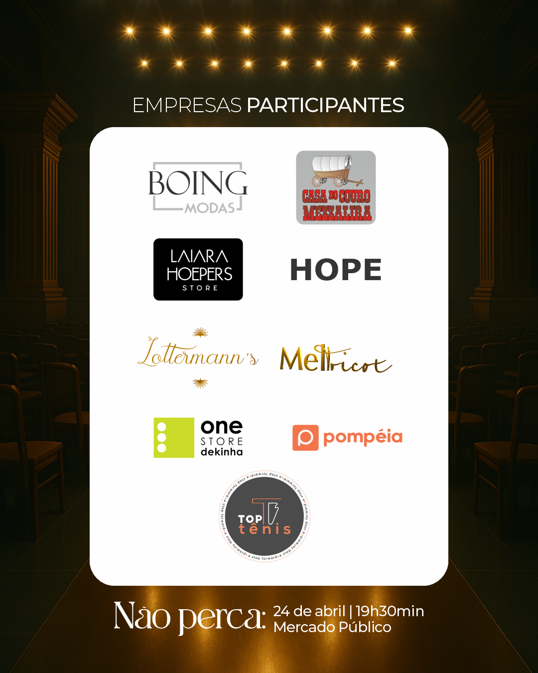 Serão 9 empresas associadas à CDL que irão desfilar: Boing, Casa do Couro Mezzalira, Hope, Laiara Hoepers, Mel Tricot, One Store, Pompeia, Lottermann’s, Top Tênis.
