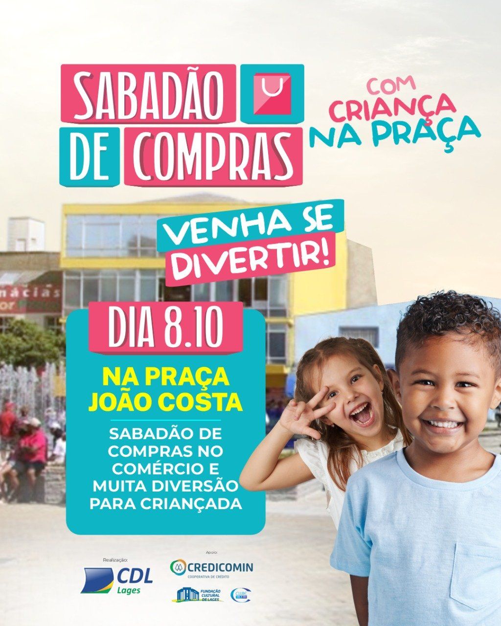 A Câmara de Dirigentes Lojistas de Lages, CDL Lages, estará na Praça João Costa, neste sábado, dia 08 de outubro, das 09h até as 13h com a ação do Sabadão de Compras e no período vespertino a CDL participa do Criança na Praça, ação promovida pela Fundação Carlos Jofre do Amaral em parceria com a Rádio Clube e Rádio Massa.