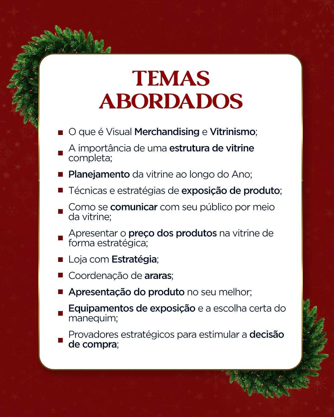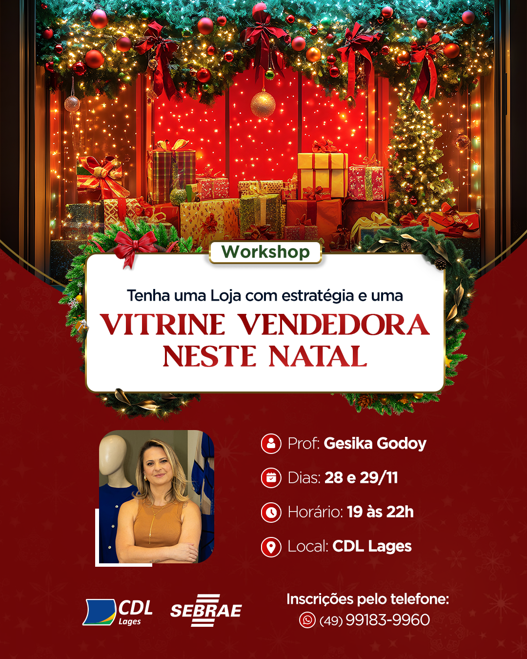 Se destaque neste Natal! Venha aprender como transformar a sua loja em um verdadeiro atrativo para os clientes. As vagas são limitadas, então garanta já a sua! Para mais informações e inscrições, entre em contato pelo telefone (49) 3221-7007 ou (49) 99183-9960.
